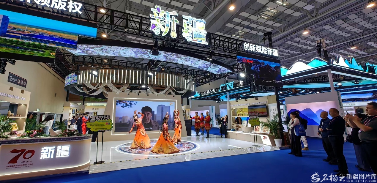 10月16日至18日,第十届中国国际版权博览会(以下简称“版博会”)在青岛举办。新疆展区以“铸牢中华民族共同体意识”为主题,携410件涵盖书籍、音像制品、书法作品、绘画、剪纸、摄影作品、工艺品、文创产品、服饰、乐器、刺绣等类别的版权精品精彩亮相。这些精品并非单纯的文化展品,而是以版权保护为支撑、以文化润疆为内核的活态载体。通过“静态展示+动态展演+互动体验”的立体呈现模式,将自治区成立70年来的版权实践浓缩成一幅兼具历史厚度与现代活力的文化画卷。