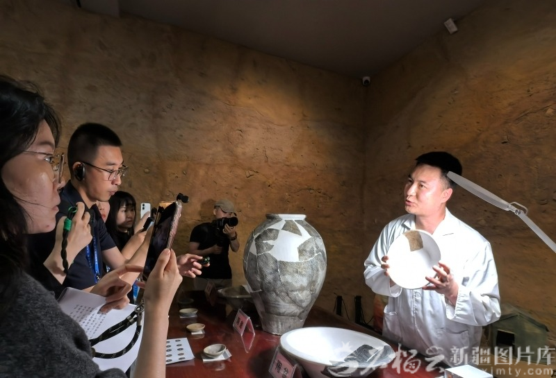 刘潇(右一)向媒体记者介绍文物修复流程。受访者供图