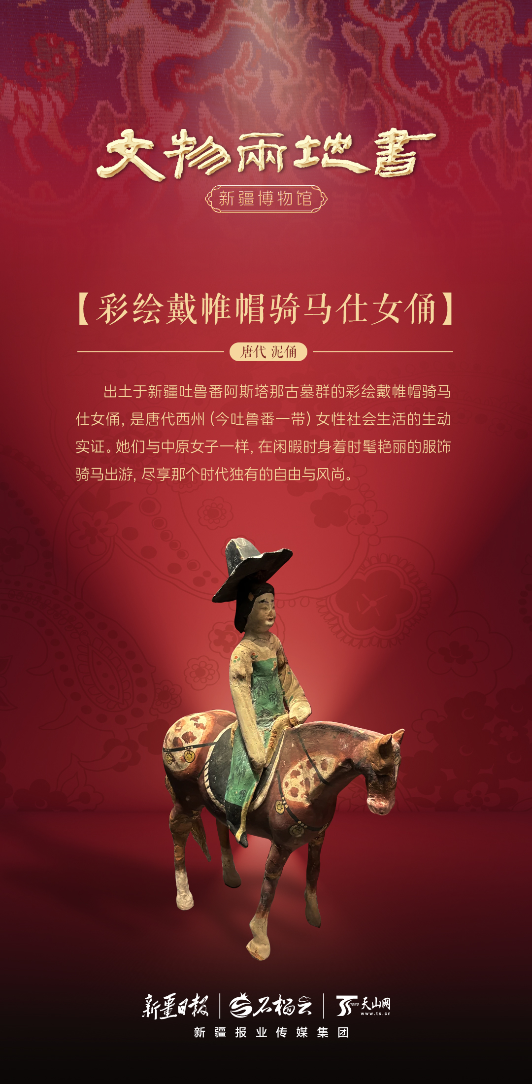 出土于新疆吐鲁番阿斯塔那古墓群的彩绘戴帷帽骑马仕女俑,是唐代西州(今吐鲁番一带)女性社会生活的生动实证。她们与中原女子一样,在闲暇时身着时髦艳丽的服饰骑马出游,尽享那个时代独有的自由与风尚。