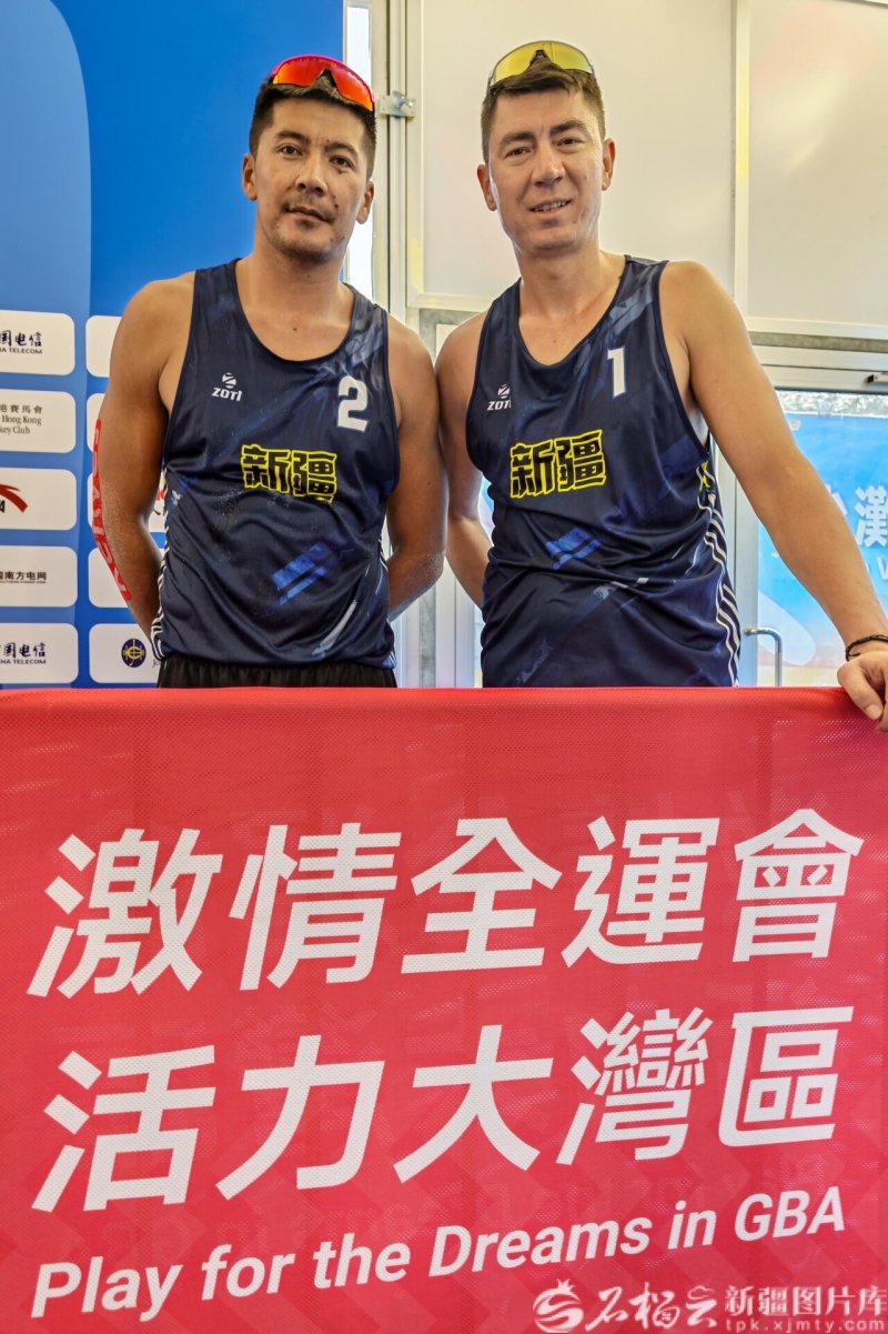 11月4日,第十五届全国运动会沙滩排球男子C组第30场比赛,新疆一队阿卜杜哈力克江·穆太力普/萨拉木·艾哈买提组合赛后合影。资料图