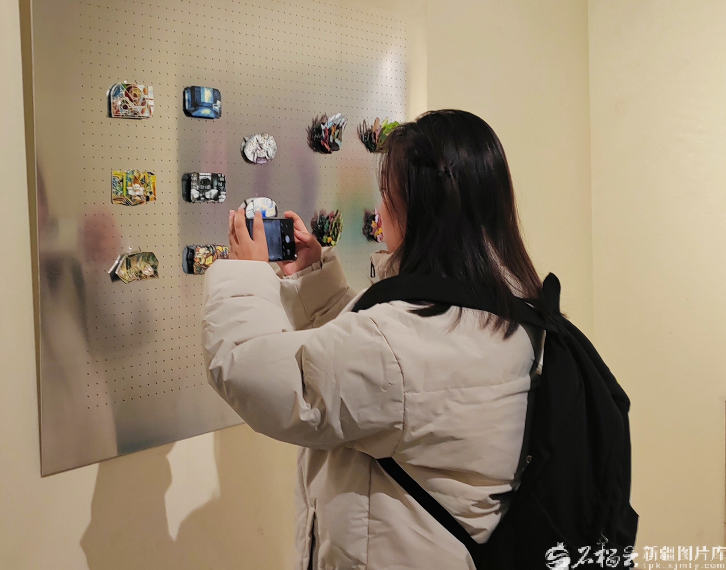 一名观众在展览前拍照留念。石榴云/新疆日报记者 贾春霞摄
