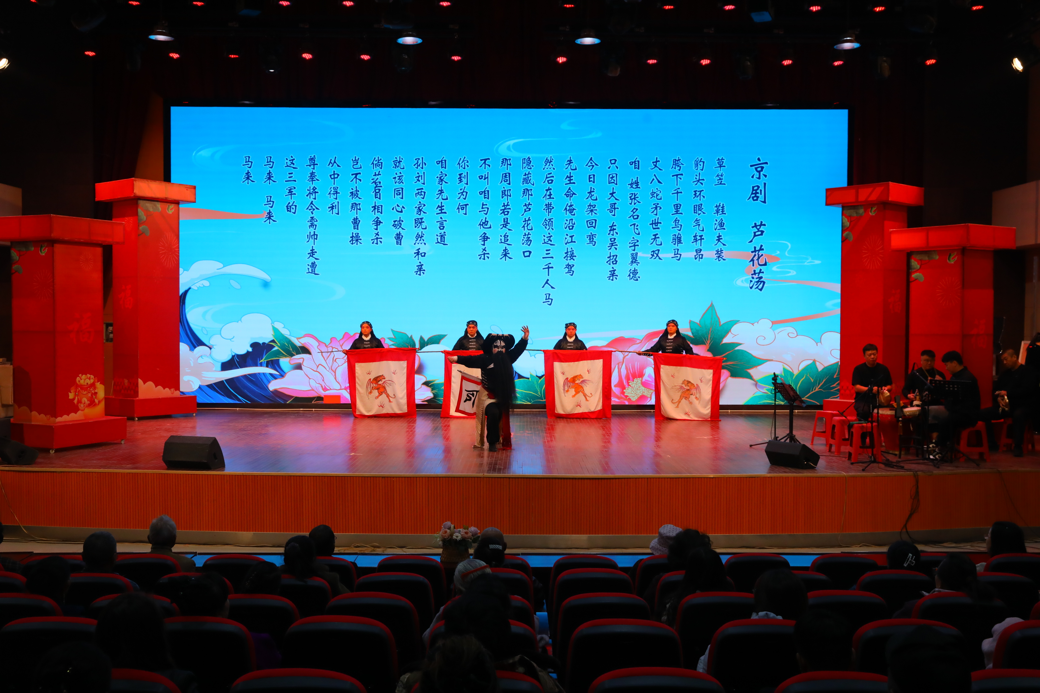 随后,经典乐队曲牌《夜深沉》奏响,激昂婉转的旋律交织回荡,尽显传统器乐的独特,让观众瞬间沉浸在典雅的艺术氛围中。紧接着,一幕幕经典京剧片段轮番登场,好戏连台,《芦花荡》中,演员们身段利落、唱腔铿锵,将角色的豪迈气概演绎得入木三分;《天女散花》里,表演者水袖翻飞、舞姿曼妙,一招一式尽显功底,仿佛将观众带入诗情画意的仙境;《数板》节奏明快、吐字清晰,展现了京剧念白的独特魅力;《八大锤》中的武戏片段更是精彩绝伦,演员们一招一式刚劲有力、行云流水,精湛的技艺让现场观众目不暇接,叫好声此起彼伏。