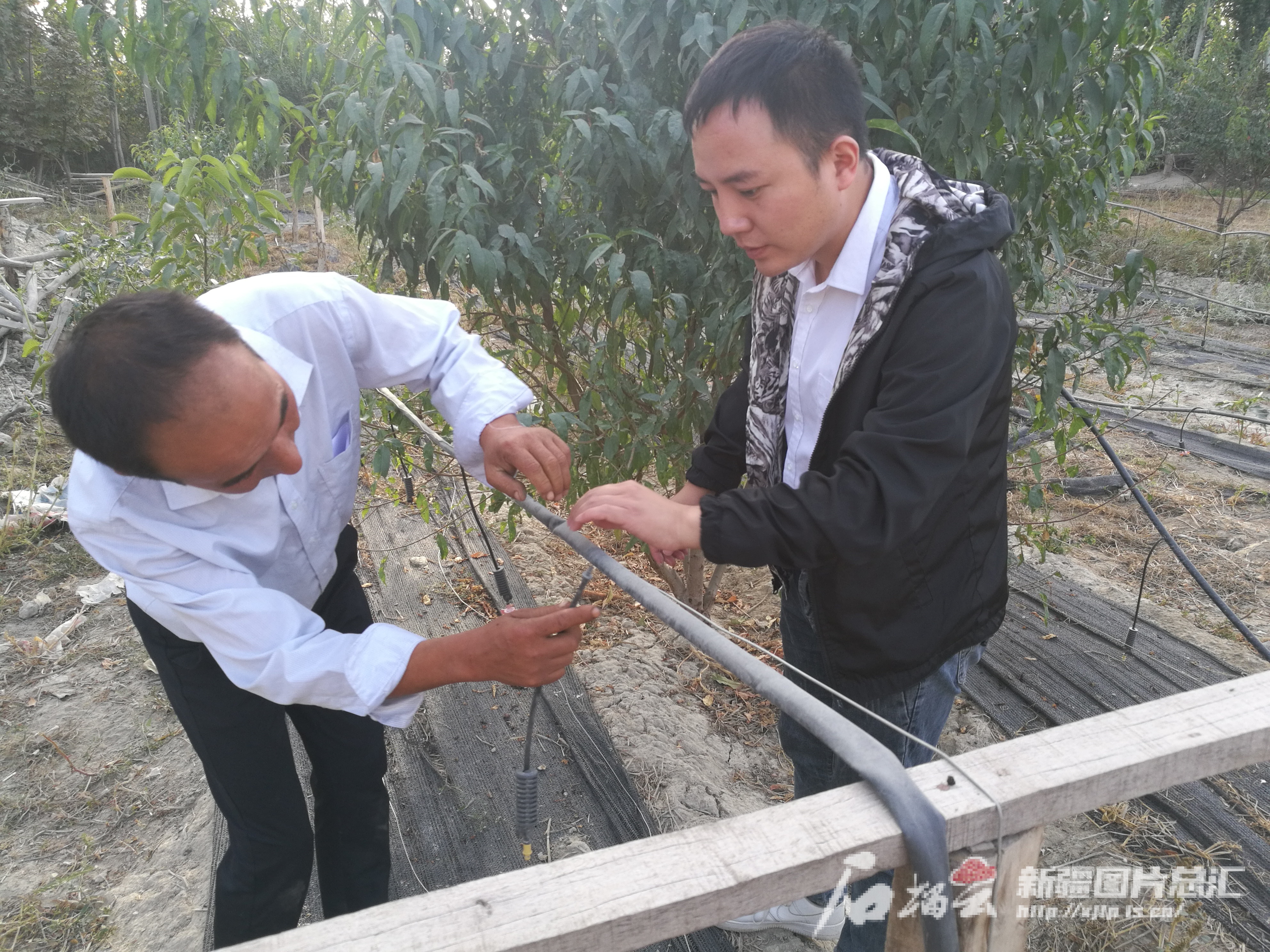 金冠华(右)和村民在修滴灌设施。受访者供图