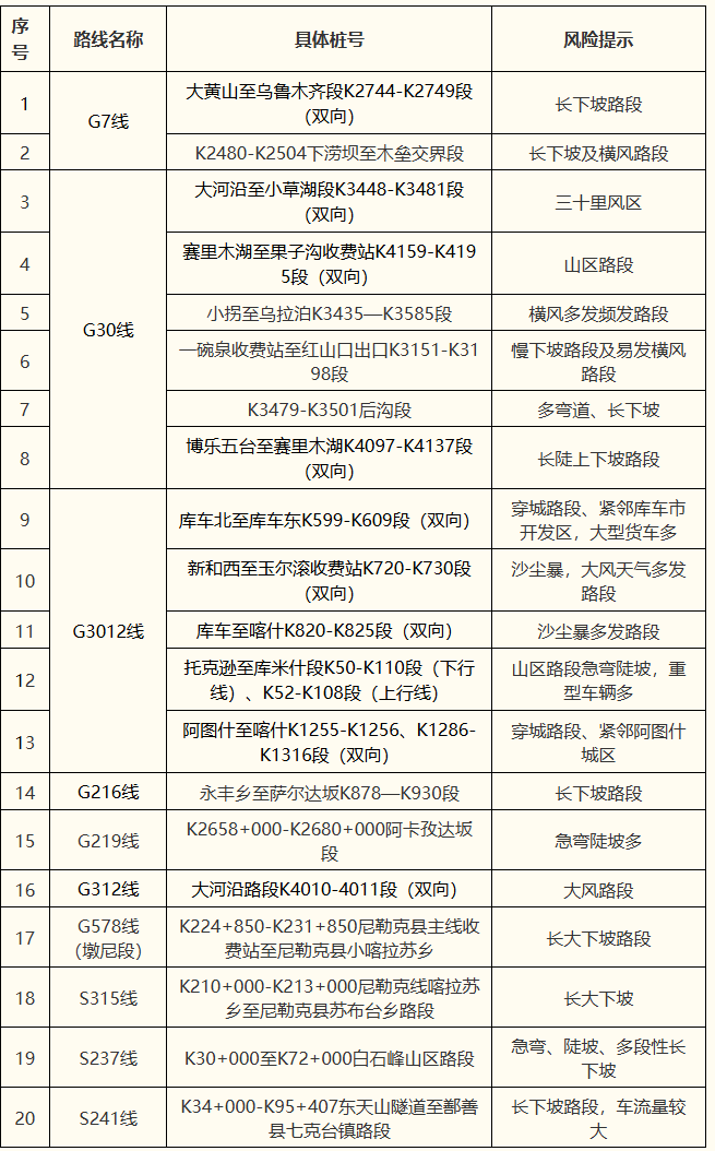 G30、G312、G217、G218、G219、G314、G315、G3016、G3015等干线公路沿线,将不同程度受降水、大风、降雪等天气影响,其中伊犁河谷果子沟段、塔城老风口路段、玛依塔斯风区路段、阿勒泰山区路段、南疆山区路段影响尤为显著。