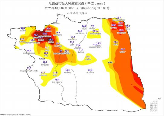 图1吐鲁番市10月2日08时至3日08时极大风速实况图(米/秒)