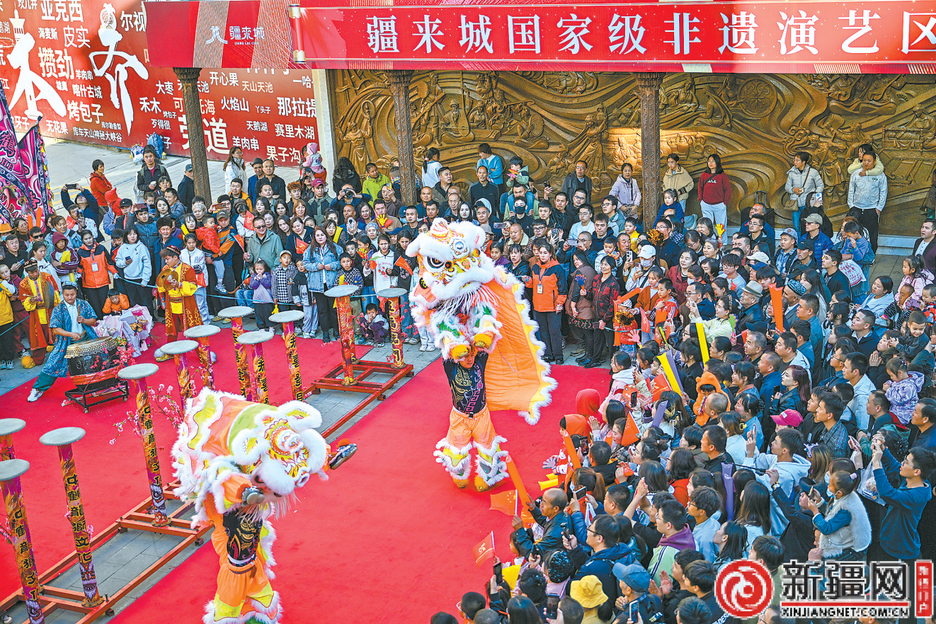 10月6日,在疆来城,龙狮队以矫健的身手和精湛的技艺展演,吸引市民游客驻足欣赏。