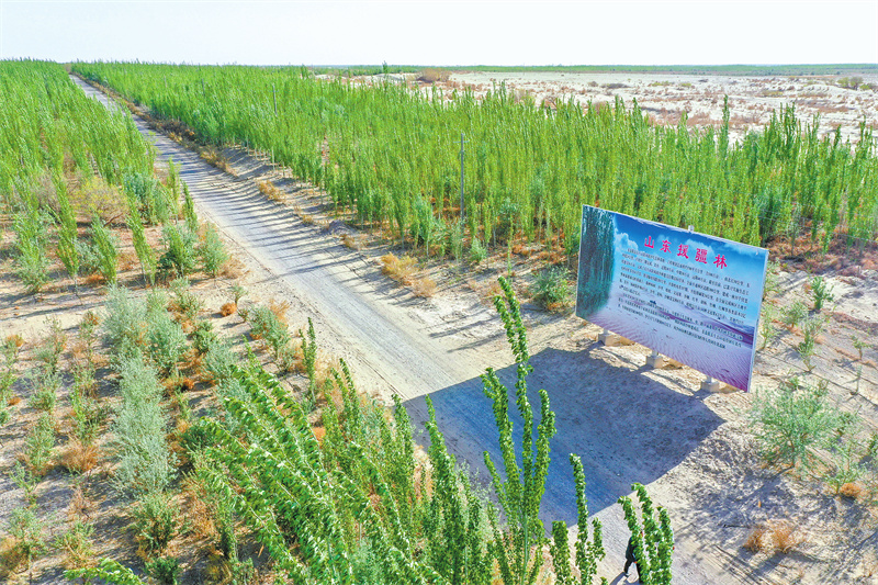 2014年至2017年是生态林规划建设的关键阶段,这期间援疆资金累计投入4200万元,全部用于防风固沙生态林的水、电、路、滴灌、供水管网等基础设施建设,助力生态林面积扩大至20余万亩。因此,这片生态林还有一个名字——山东援疆林。