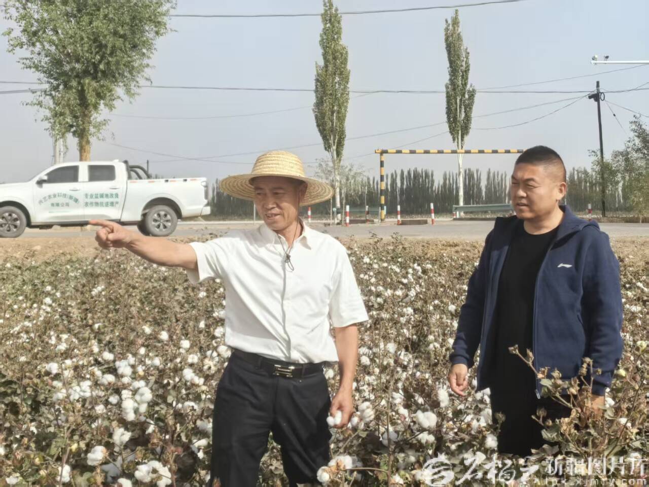 9月27日,柯坪县阿恰勒镇改良盐碱地里,宋胜年(左)在查看棉花长势。陈金毛摄