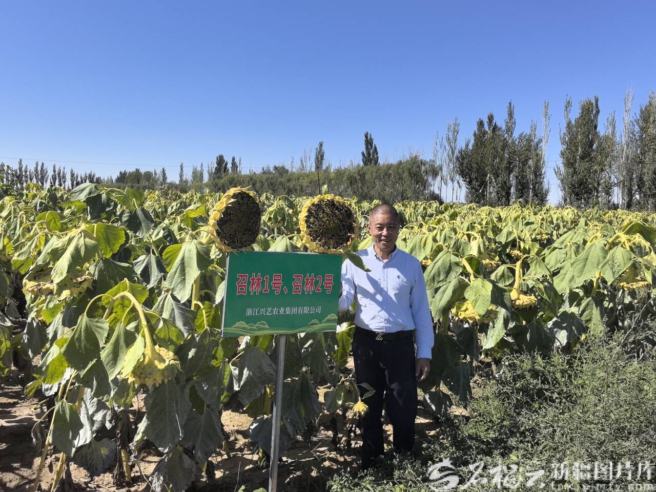 9月1日,新疆生产建设兵团第三师图木舒克市的农田里,宋胜年在查看葵花长势。于孟康摄