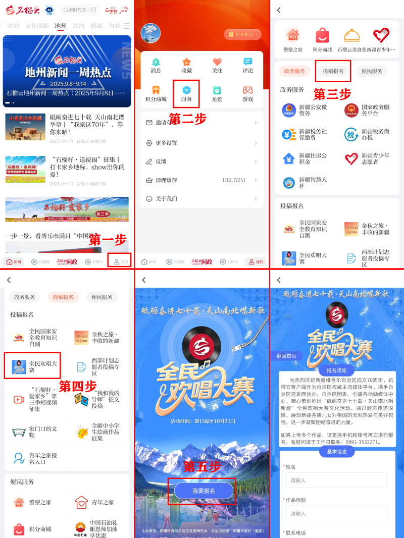 1、 下载“石榴云”客户端,打开首页右下角“我的”→服务→投稿报名→全民欢唱大赛→报名(如图所示)。