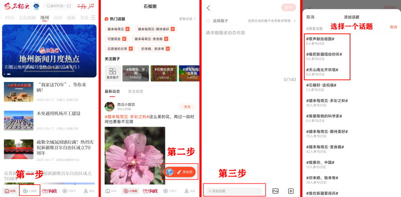 如何在“石榴圈”发布动态?登录石榴云客户端下方“石榴圈”,选择话题#歌声献给祖国#、#我把新疆唱给你听#、#天山南北齐欢唱#,即可发布圈子内容。