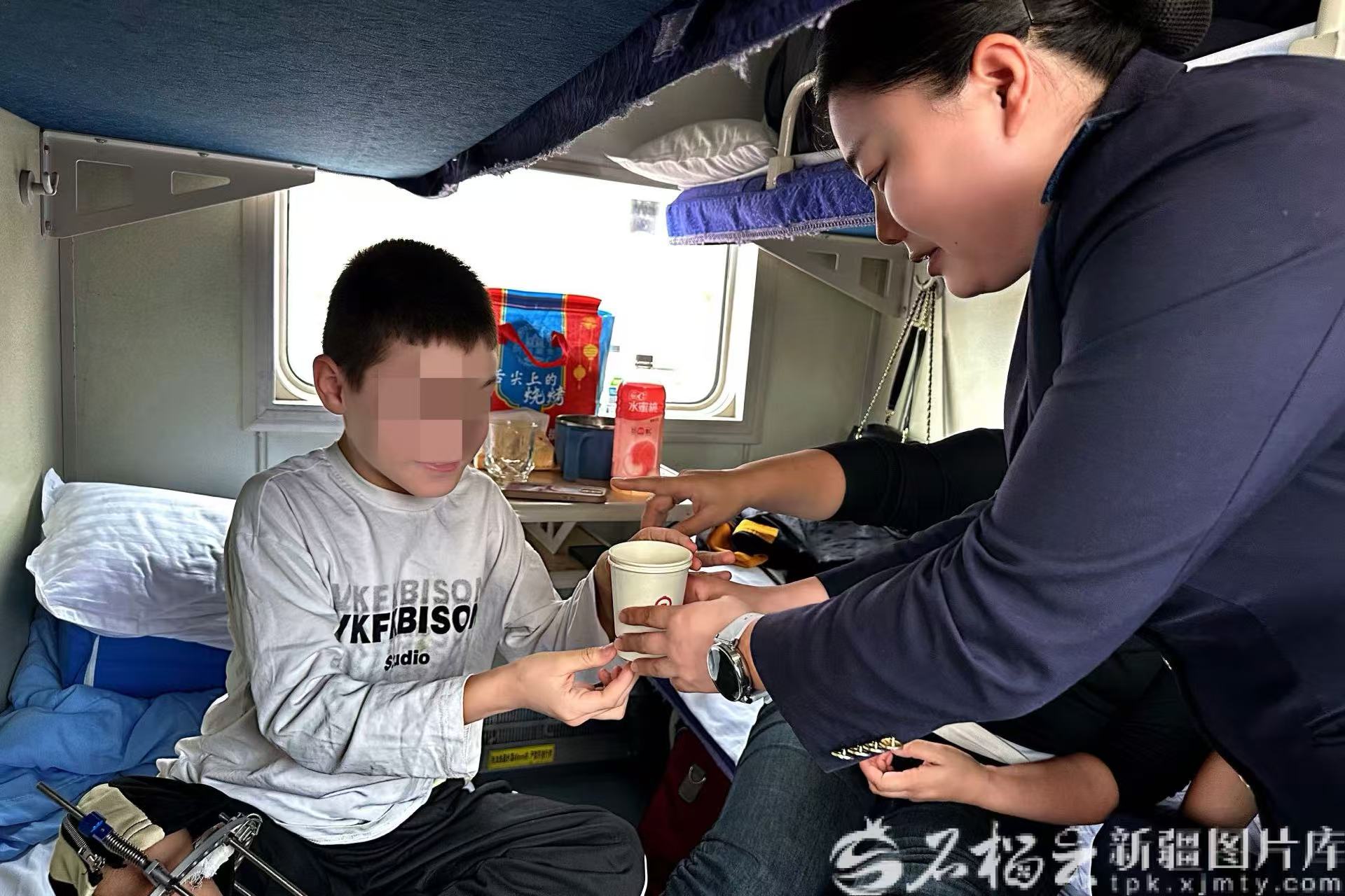 “小朋友,刀口疼不疼?”每隔1小时,乘务员就会来到孩子们的铺位前,询问身体状况。到了用餐时间,乘务员提前加热餐食,端到铺位旁协助家长照料用餐。夜间行车时,乘务员巡查车厢,查看孩子们有没有盖好被子。遇到一名手臂仍缠着纱布的孩子,乘务员从列车医药箱里拿出无菌棉签,手把手教家长清洁刀口周围,保持干净卫生。