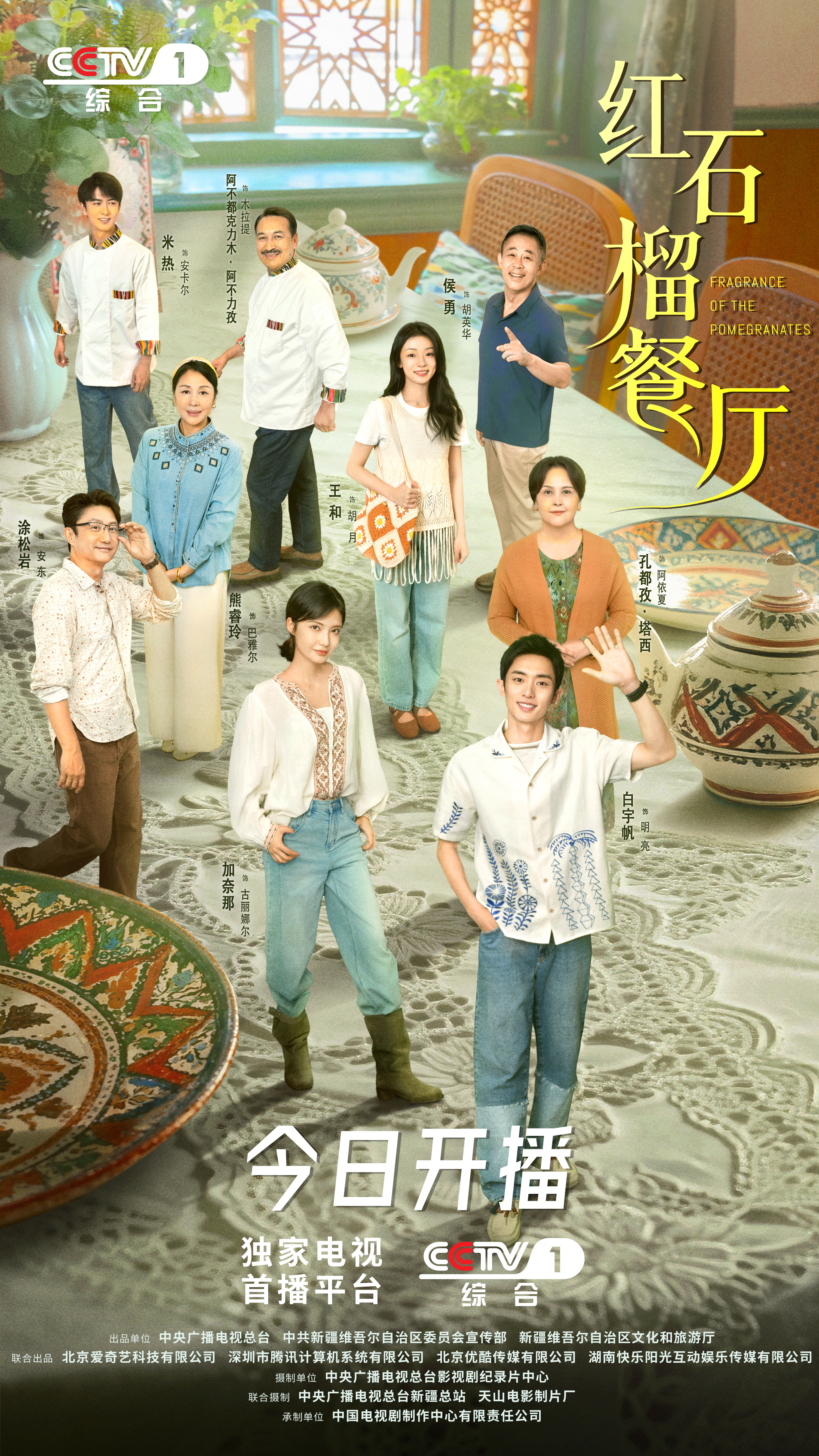 今日,由中央广播电视总台、中共新疆维吾尔自治区委员会宣传部,新疆维吾尔自治区文化和旅游厅共同出品,北京爱奇艺科技有限公司、深圳市腾讯计算机系统有限公司、北京优酷传媒有限公司、湖南快乐阳光互动娱乐传媒有限公司联合出品,中央广播电视总台影视剧纪录片中心摄制,中央广播电视总台新疆总站、天山电影制片厂联合摄制,中国电视剧制作中心有限责任公司承制,白宇帆、加奈那领衔主演,涂松岩、刘芮麟、王和特别主演,高至霆特邀主演,孔都孜·塔西、阿丽玛、熊睿玲、阿不都克力木·阿不力孜、米热、江依昊、卡迪林娜主演,丁勇岱、林永健、侯勇、郝平、李健、张晞临、钱波、尚大庆友情出演的首部新疆都市情感剧《红石榴餐厅》正式开播,将于20:06在CCTV-1黄金档播出,22:00于爱奇艺、腾讯视频、优酷、芒果TV网络平台同步上线。