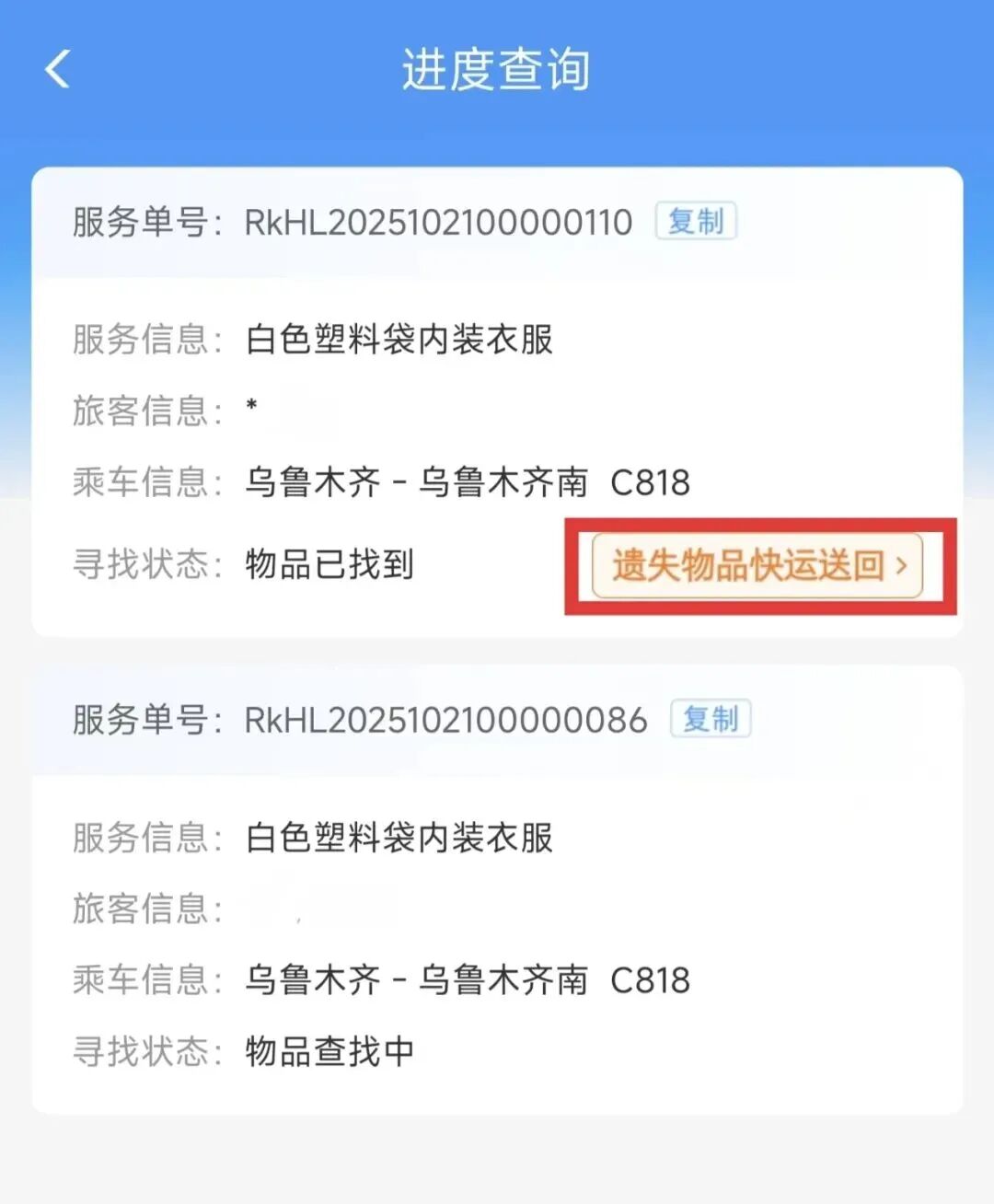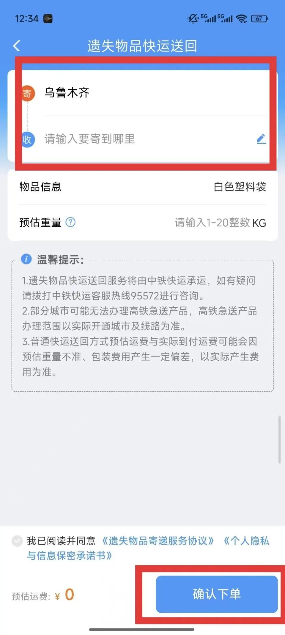 一旦物品确认找到,铁路工作人员会在24小时内与你联系。此时无需奔波到站领取,只需在“进度查询”中点击“遗失物品快运送回”,填写收货信息,就能选择两种便捷服务:着急用的物品选“高铁急送”,普通物品选“普通快运”。两种服务均支持到付,收费透明规范,让你放心无忧。