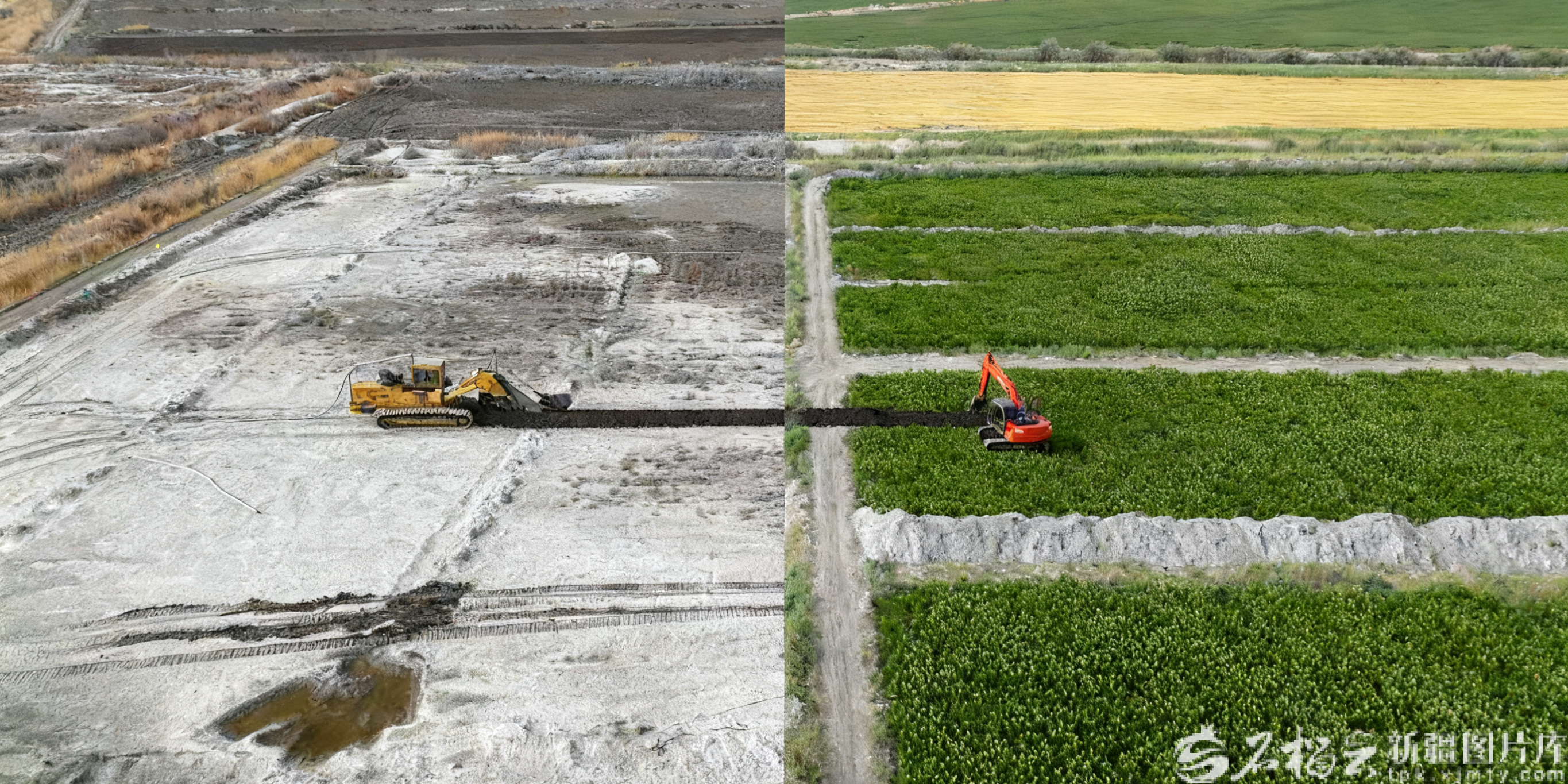 国家重点研发专项“新疆绿洲节水抑盐灌排协同产能提升技术模式与应用”使得重度盐碱地改良实现吨良田,图为改造前后对比图(资料图片)。自治区农科院供图