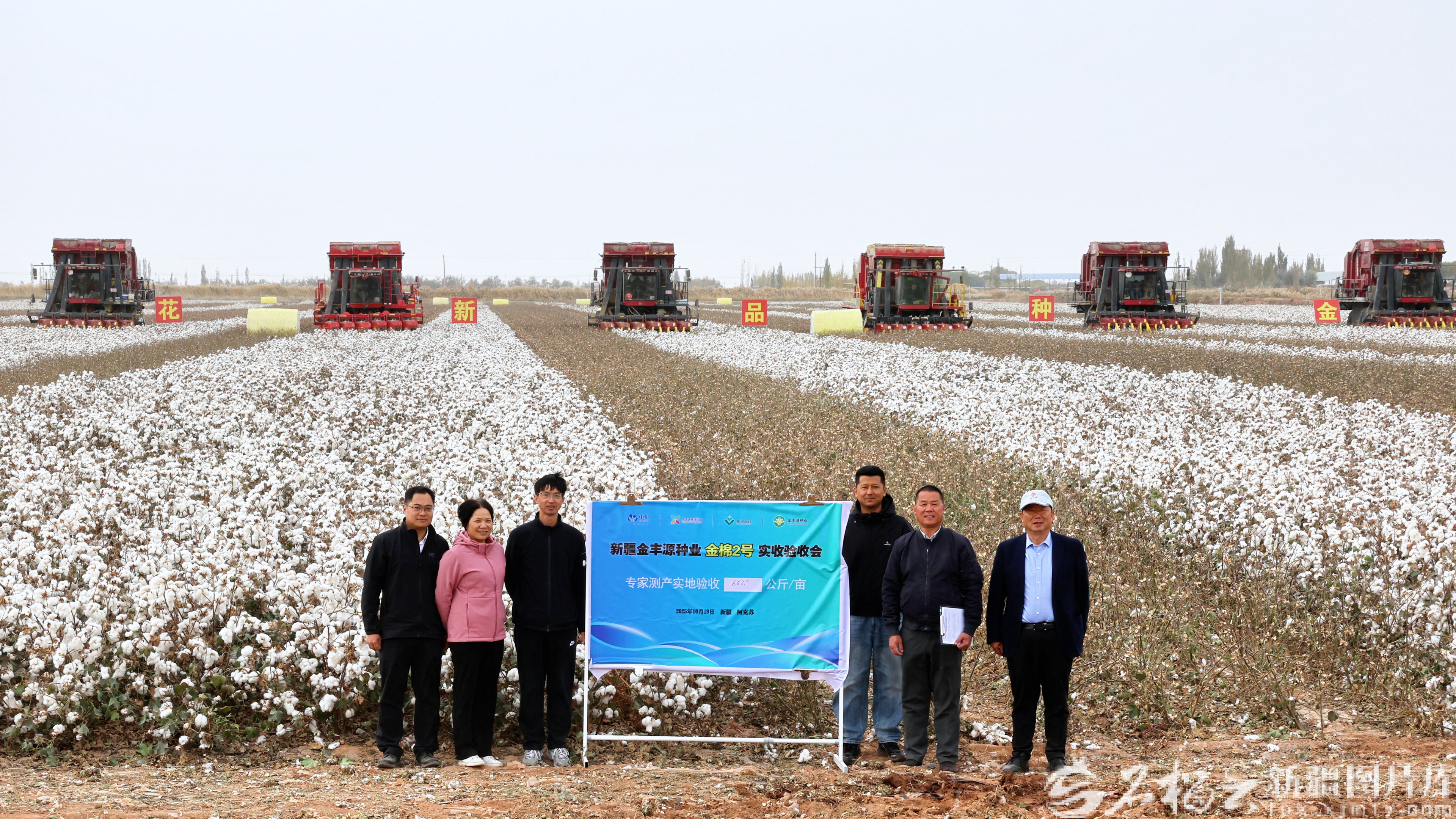 近日,新疆金丰源种业有限公司依托国家农业科技重大项目——耐逆丰产棉花新品种设计与培育,培育出耐逆棉花新品种“金棉2号”进行实收测产(资料图片)。新疆金丰源种业有限公司供图