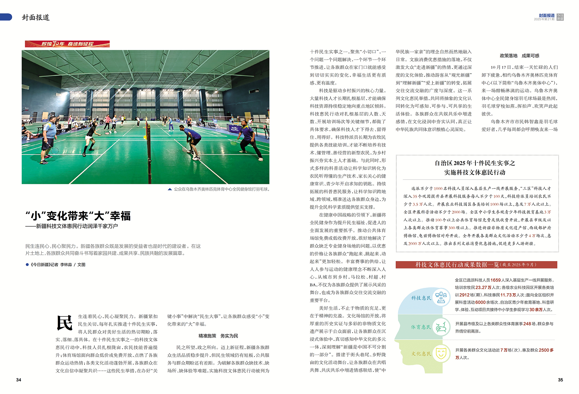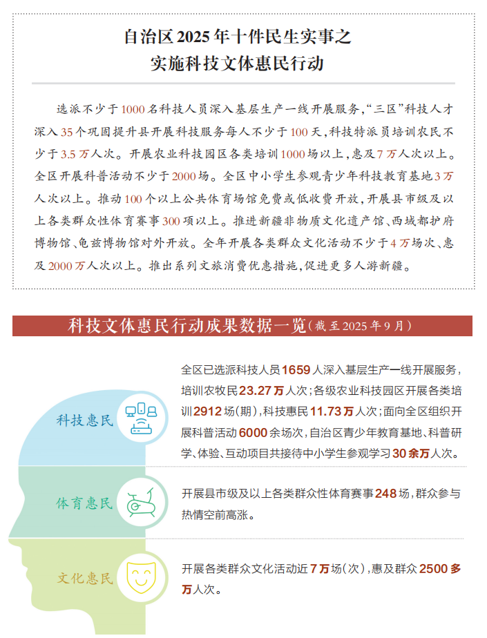 民之所望,政之所向。迈上新征程,新疆各族群众生活品质稳步提升,但民生领域仍有短板,公共服务与群众期盼还有差距。为破解各族群众缺技术、缺场所、缺体验等难题,实施科技文体惠民行动被列为十件民生实事之一,聚焦“小切口”,一个问题一个问题解决,一个环节一个环节推进,让各族群众在家门口就能感受到切切实实的变化,幸福生活更有质感、更有温度。