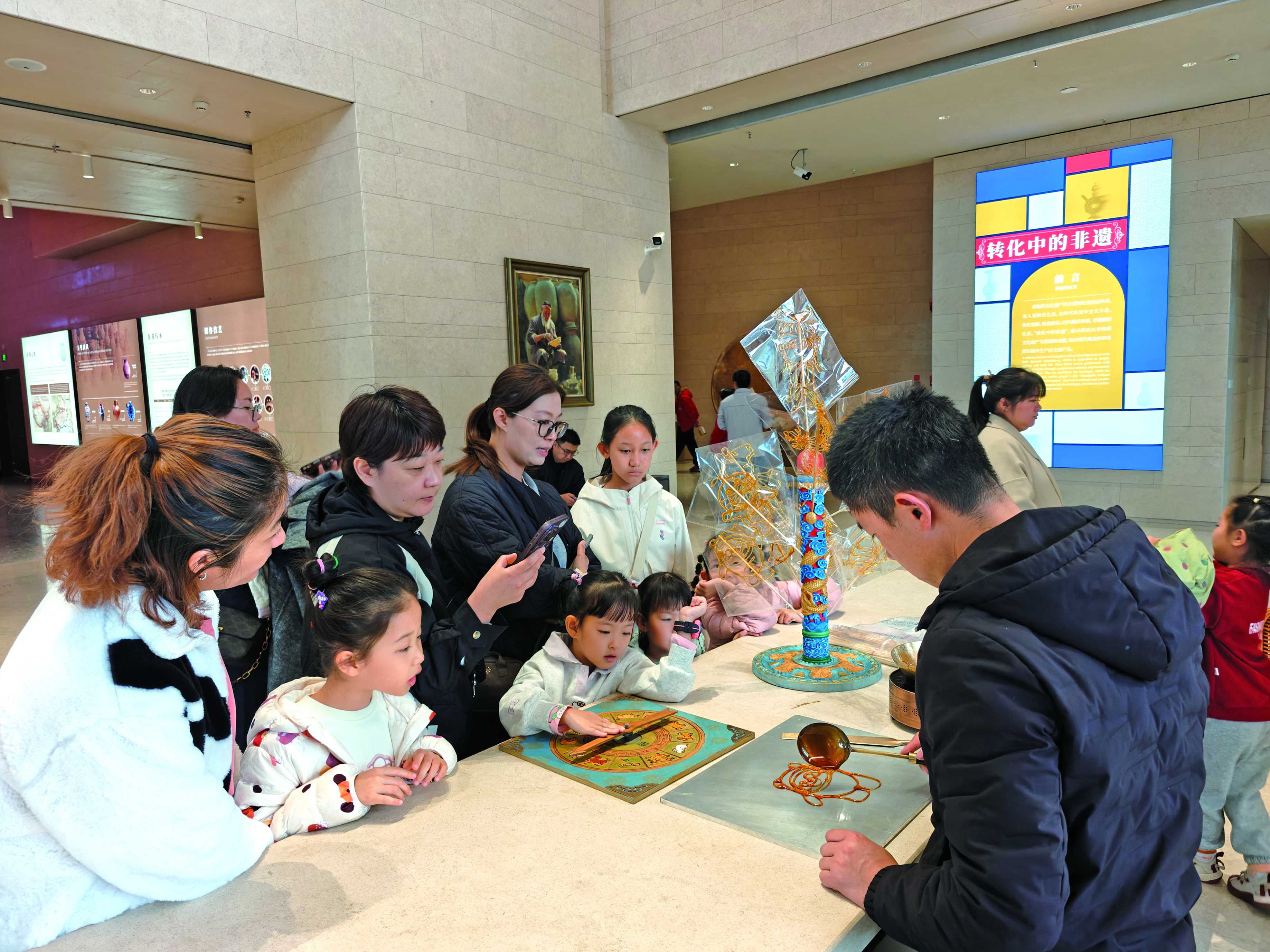 新疆非物质文化遗产馆非遗手工艺体验区,乌鲁木齐市级非物质文化遗产代表性项目糖塑县级非遗代表性传承人刘孝卿(右三)为孩子们制作糖画。