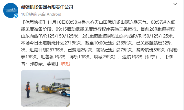 另据新疆机场集团有限责任公司微博消息,11月10日8:50,乌鲁木齐天山国际机场出现冻雾天气,8:57进入低能见度准备阶段,9:15启动低能见度运行程序实施三类运行。目前26R跑道视程由东向西RVR125/150/125米,26L跑道视程由东向西RVR150/125/125米,本场今日出港航班计划271架次。截至10:00已起飞36架次,已关客舱航班32架次,进港计划267架次,已落地2架次,前站已起飞27架次。备降航班5架次(阿勒泰1架次,吐鲁番1架次,博乐1架次,塔城2架次),返航1架次(伊宁)。