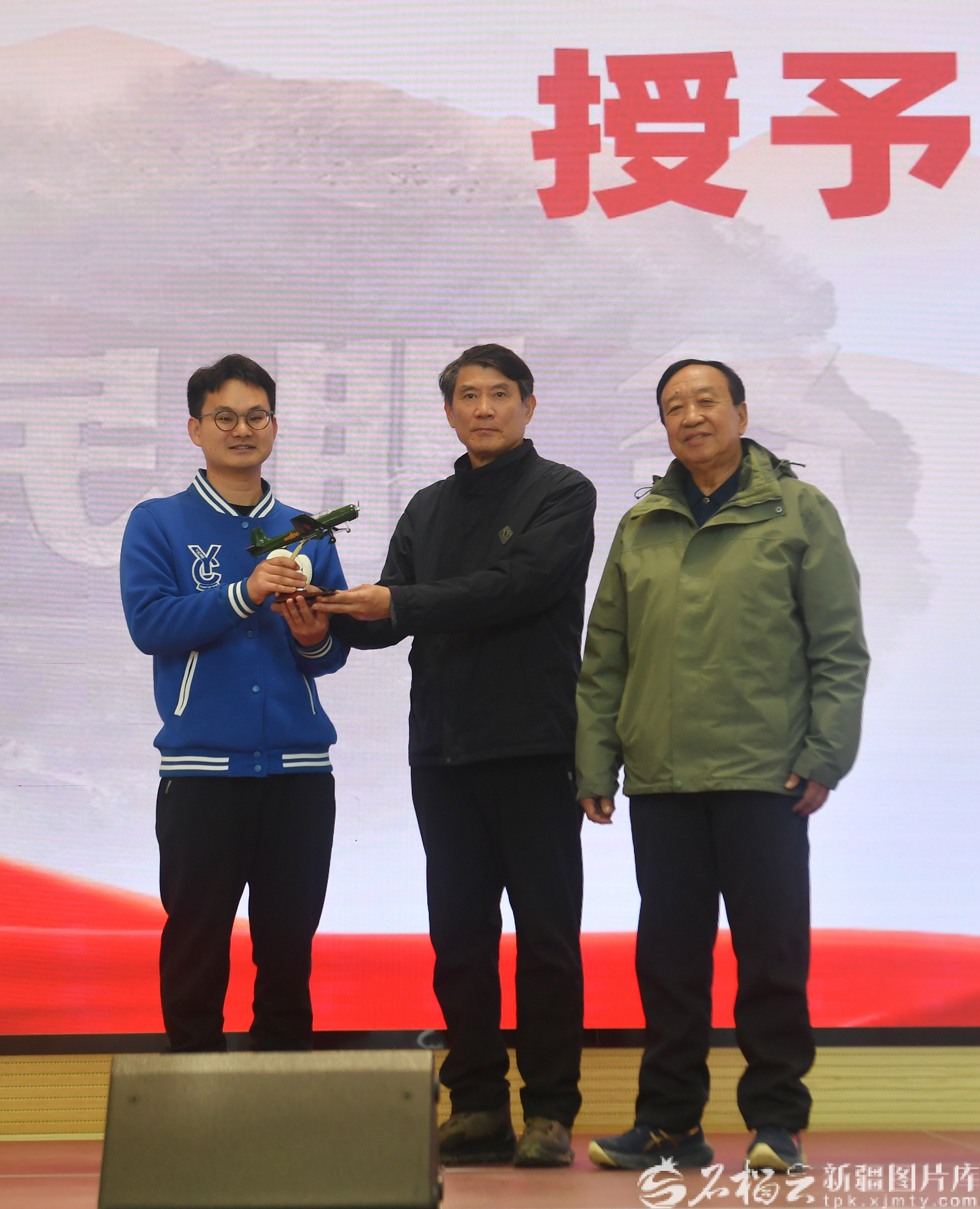 11月6日,空军老战士代表卢建华(右)、韩郑(中)向陆遥(左)赠送“初教六”飞机模型。石榴云/新疆日报记者 邹懿摄