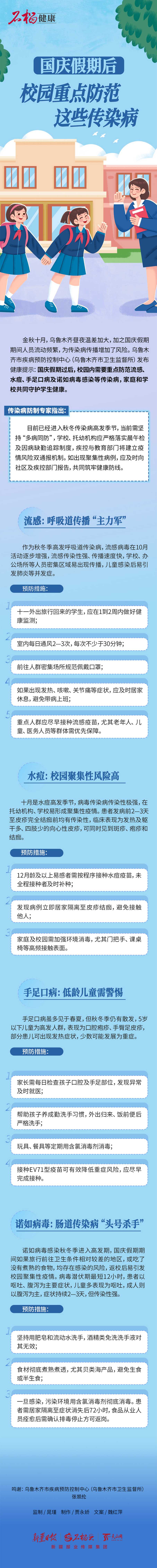 金秋十月,乌鲁木齐昼夜温差加大,加之国庆假期期间人员流动频繁,为传染病传播增加了风险。乌鲁木齐市疾病预防控制中心(乌鲁木齐市卫生监督所)发布健康提示:国庆假期过后,校园内需要重点防范流感、水痘、手足口病及诺如病毒感染等传染病,家庭和学校共同守护学生健康。