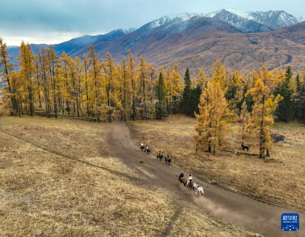 10月3日,游客在新疆阿勒泰喀纳斯景区骑马(无人机照片)。