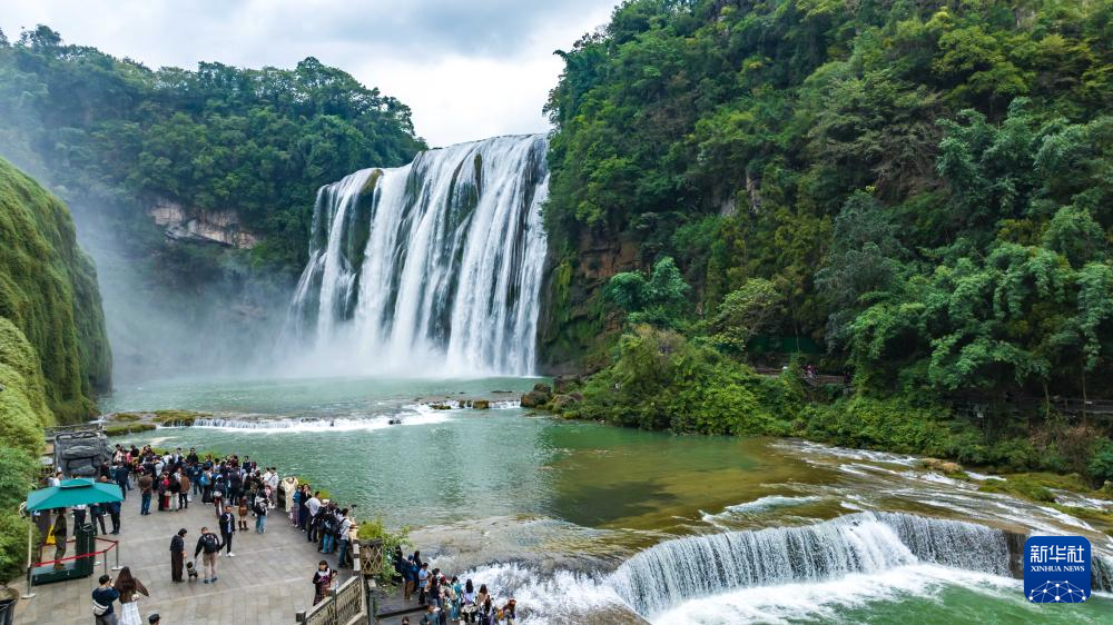 10月7日,游客在贵州省安顺市黄果树瀑布景区游览(无人机照片)。