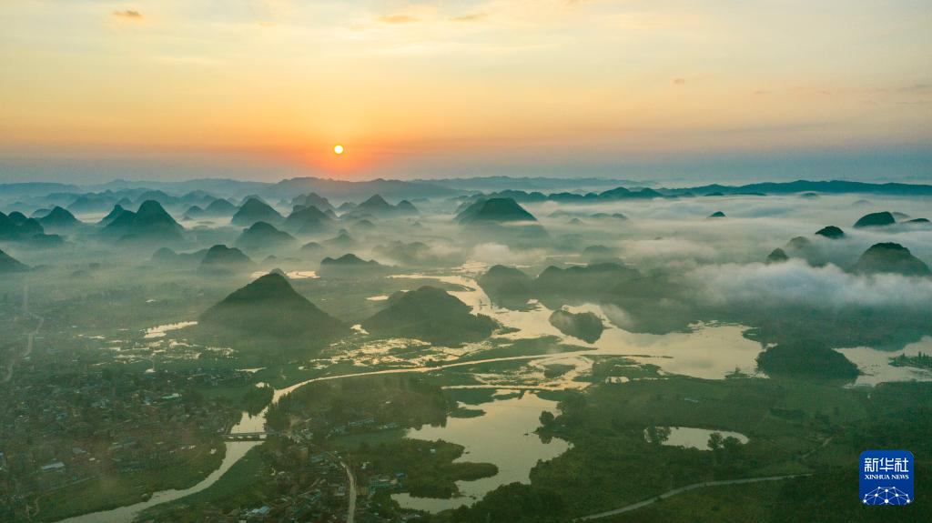 10月7日,云雾缭绕中的云南省文山壮族苗族自治州丘北县普者黑喀斯特国家湿地公园(无人机照片)。