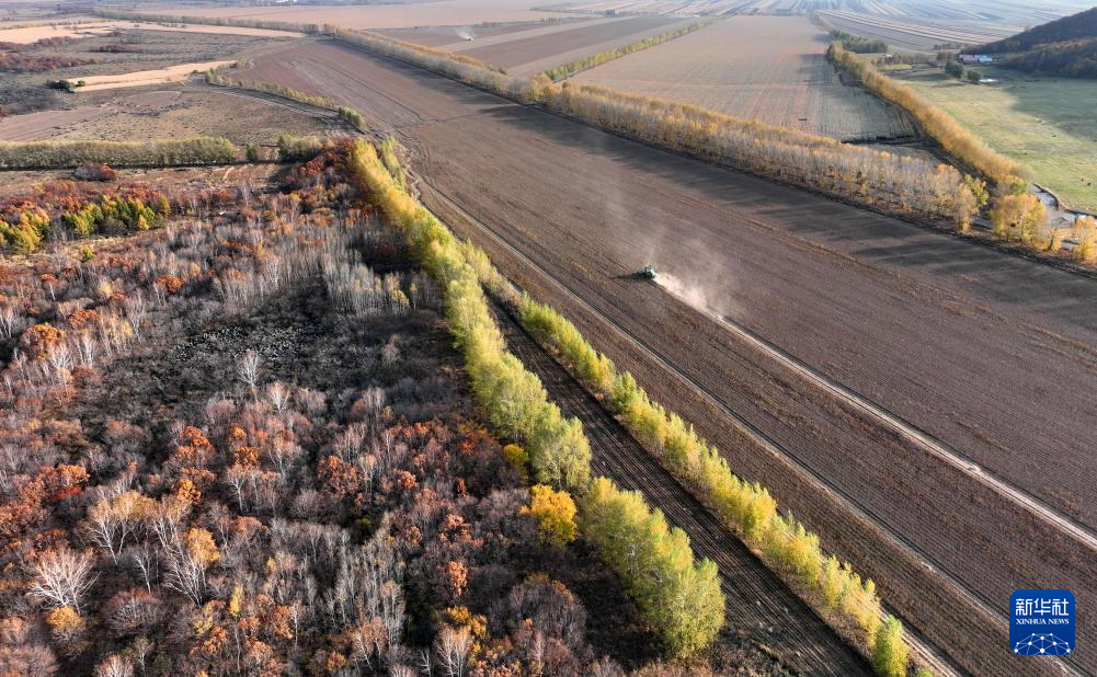 10月6日,北大荒集团黑龙江五大连池农场有限公司机车在收获大豆(无人机照片)。