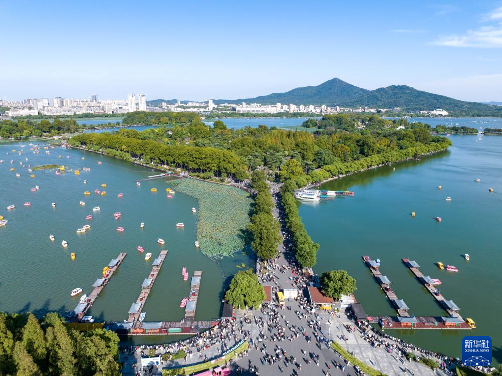 10月2日,人们在南京玄武湖景区参观游览(无人机照片)。
