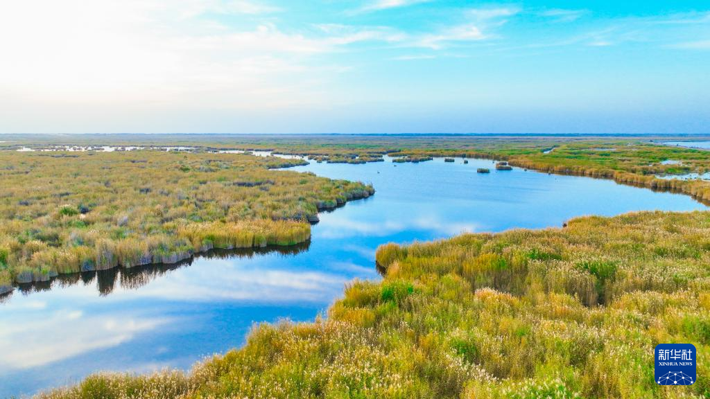 这是在新疆巴音郭楞蒙古自治州博湖县拍摄的博斯腾湖芦苇湿地(10月6日摄,无人机照片)。