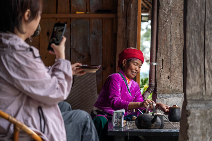 游客在云南省普洱市澜沧拉祜族自治县景迈山翁基古寨拍摄布朗族老人制作罐烤奶茶。新华社记者胡超 摄