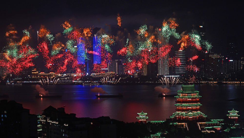10月1日,2025年南昌市国庆烟花晚会在江西省南昌市赣江老官洲水域举办。新华社记者万象摄