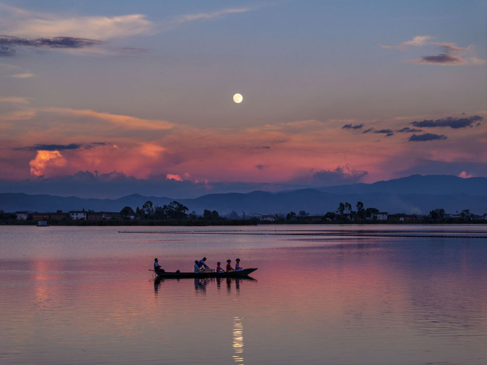 10月6日,人们乘船在云南大理洱源西湖赏月(无人机照片)。新华社发(罗新才摄)