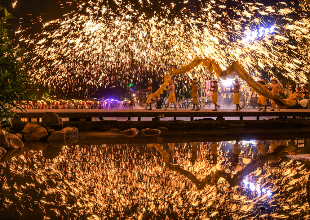 10月5日晚,在四川省成都市双流区黄龙溪古镇,民间艺人为游客表演非遗“火龙灯舞”。新华社发(李向雨摄)