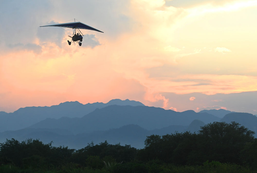 10月6日,游客在浙江省金华市武义县大斗山飞行营地乘坐动力三角翼。新华社发(张建成摄)