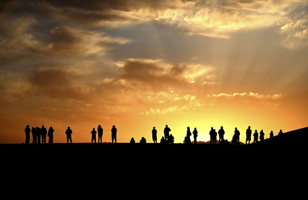 这是10月2日清晨,游客在甘肃省敦煌市鸣沙山月牙泉景区观赏大漠日出美景。新华社发(张晓亮摄)