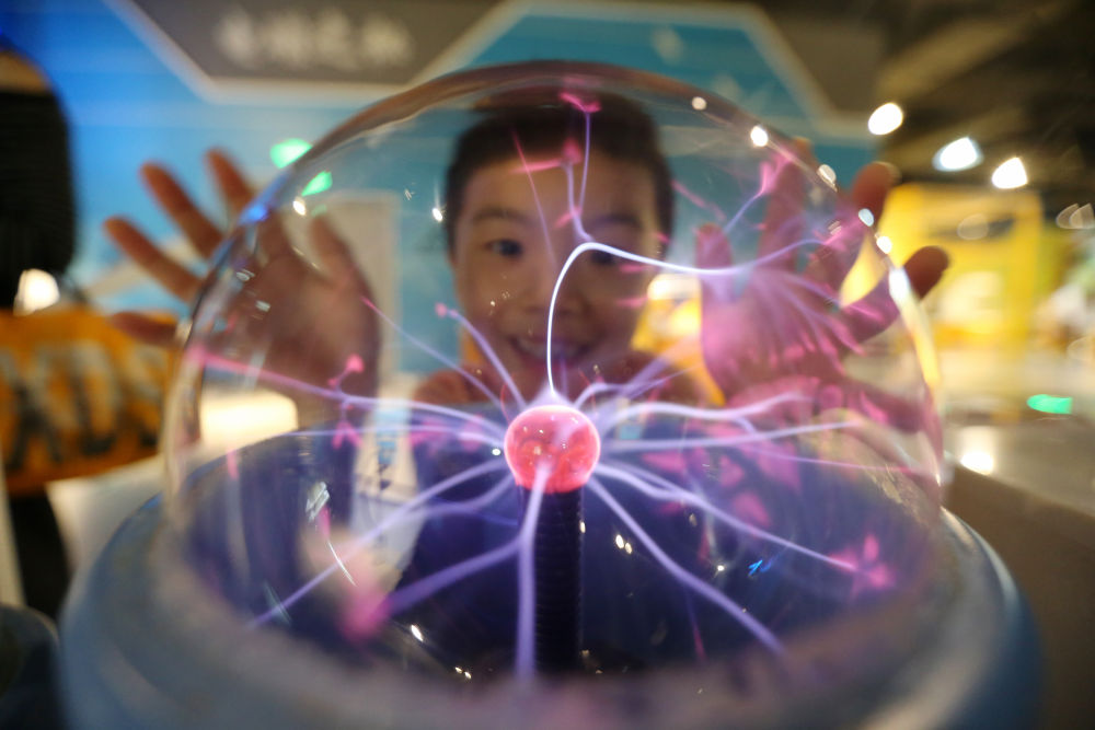 10月3日,小朋友在江苏扬州科技馆体验“辉光球”。新华社发(孟德龙摄)