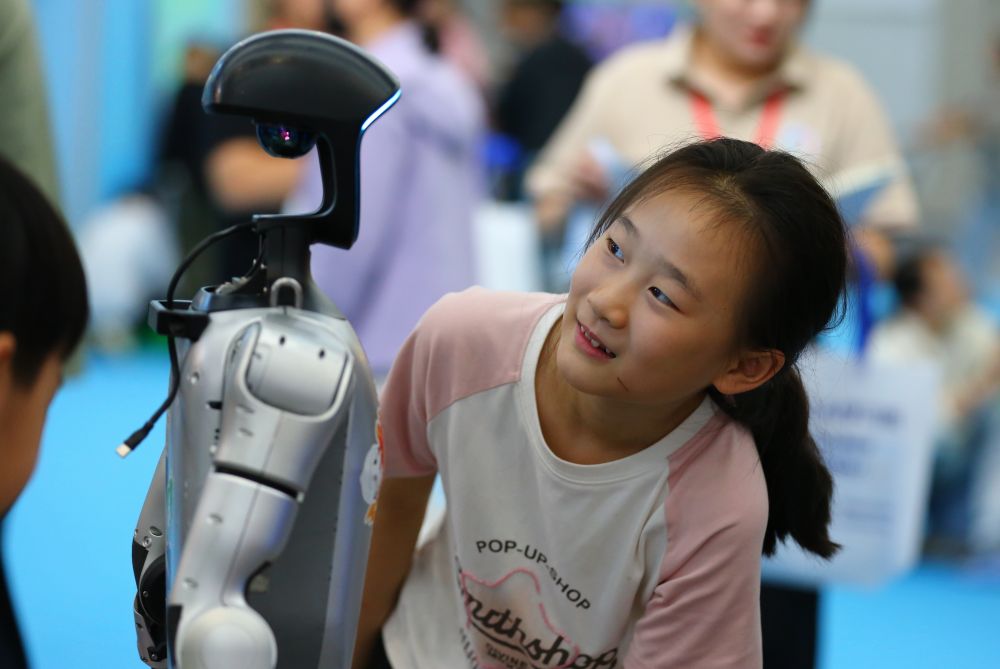 10月2日,在山东省第九届滕州书展现场,小朋友与机器人互动。新华社发(李志军摄)