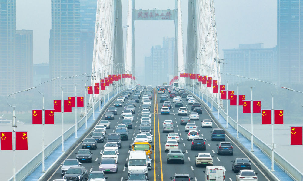 国庆假期第一天,各地迎来出行高峰。这是车辆行驶在湖北省武汉长江二桥上(无人机照片,10月1日摄)。新华社记者肖艺九摄