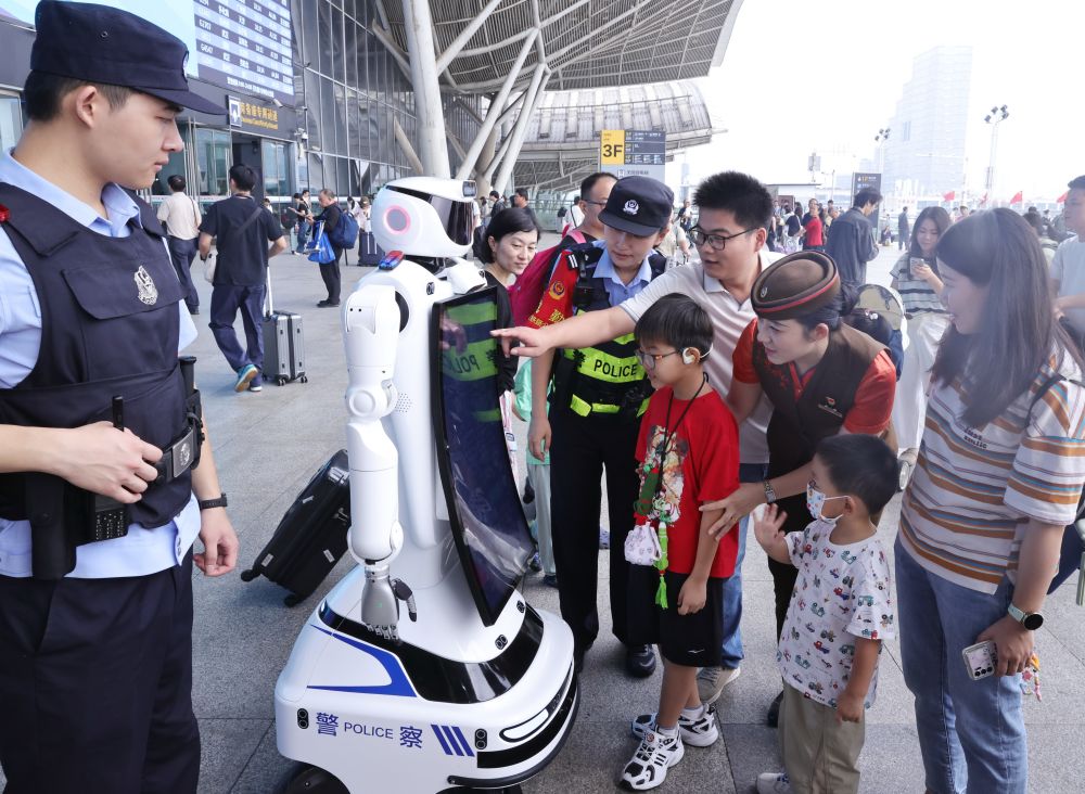 10月1日,在湖北省武汉站,小朋友和机器人互动。新华社发(赵军摄)