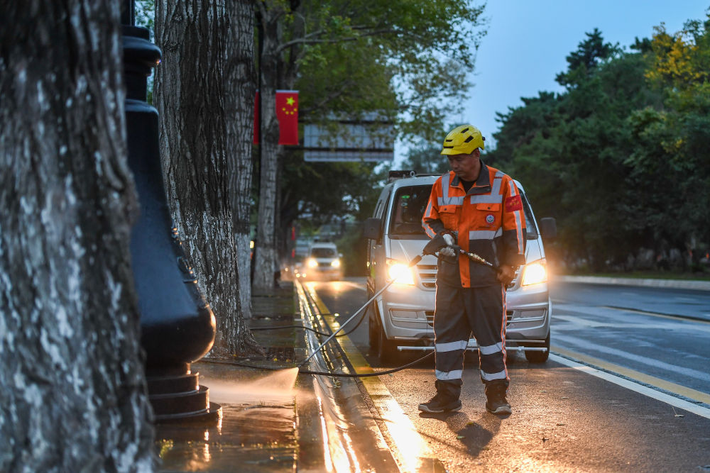 10月1日,环卫工人在吉林省长春市朝阳区新民大街清扫人行步道。新华社记者张楠摄