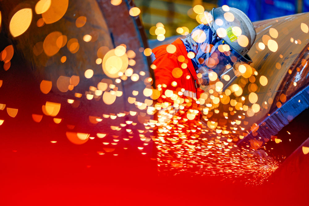 这是10月1日,在天津市滨海新区,渤海油田工人进行打磨作业。新华社发(杜鹏辉摄)