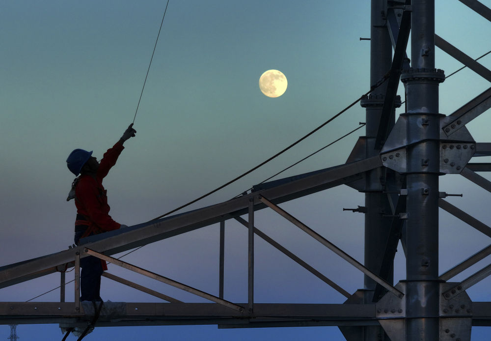 10月6日,在湖南省衡阳市雁峰区,高塔架线工人在月光的映射下施工(无人机照片)。新华社发(曹正平摄)