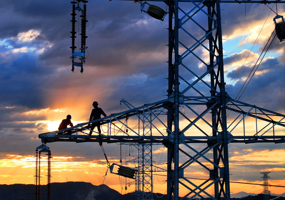 10月6日,在湖南省衡阳市雁峰区南三环路上,湖南雁能建设集团有限公司的施工人员在高塔进行架线施工作业(无人机照片)。新华社发(曹正平摄)