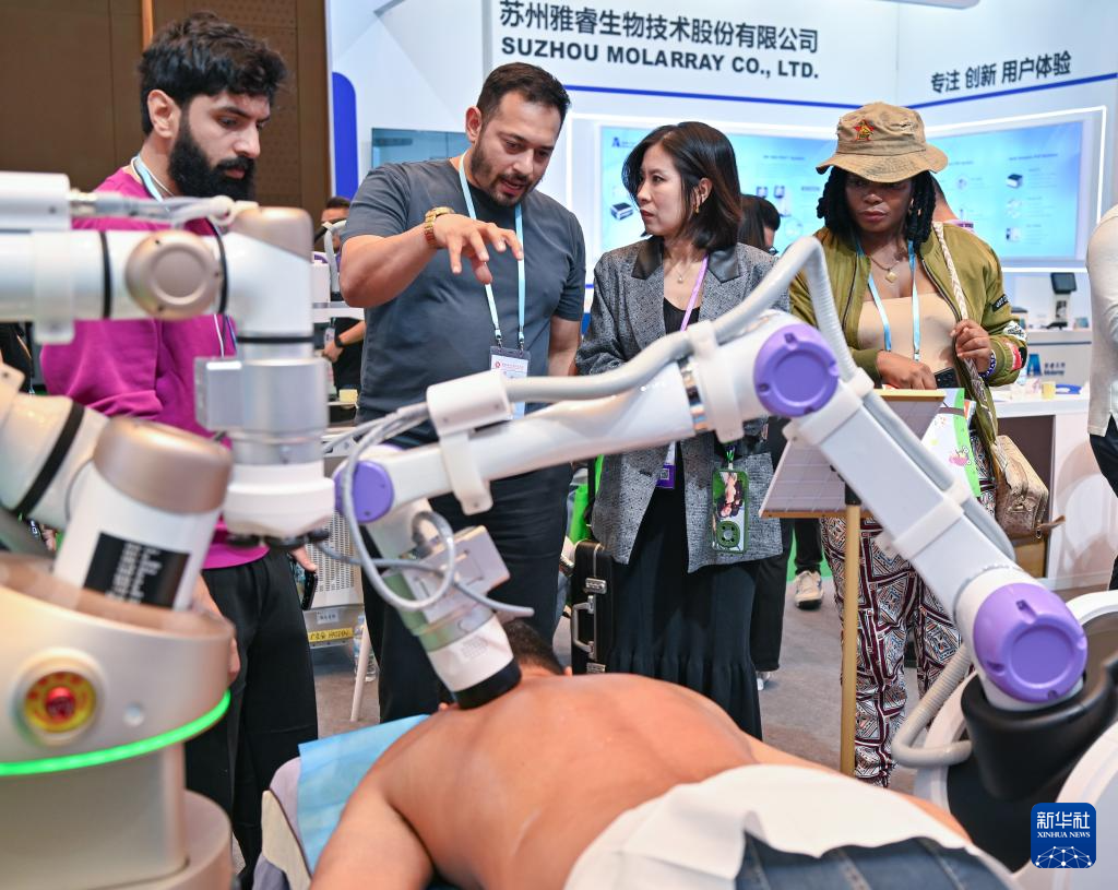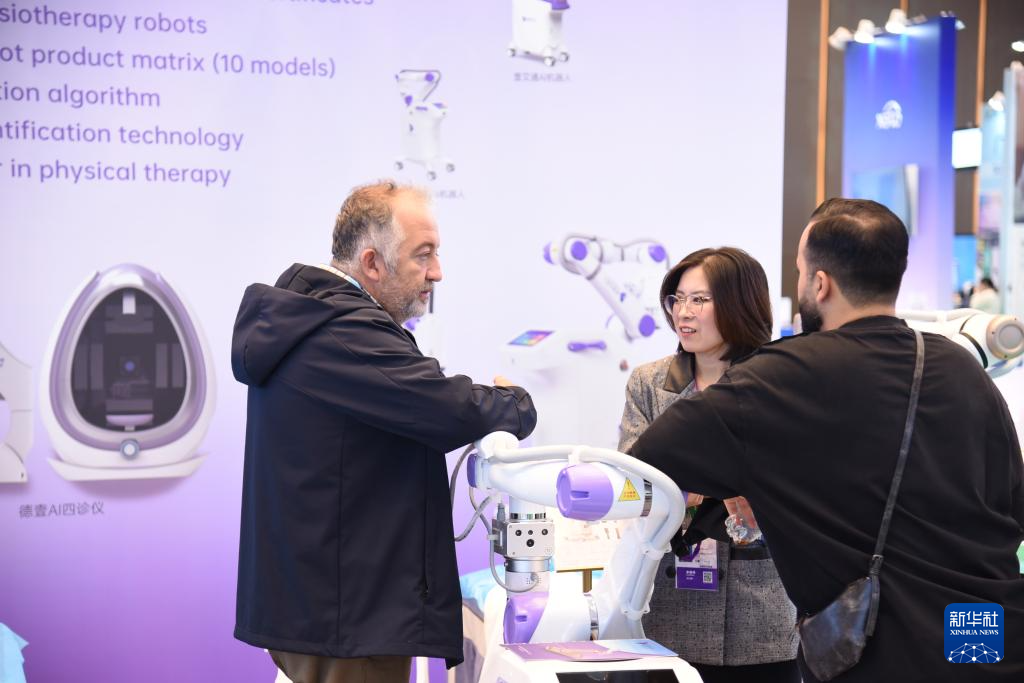 11月3日,客商在广交会展馆了解一款理疗机器人。新华社记者 肖恩楠 摄