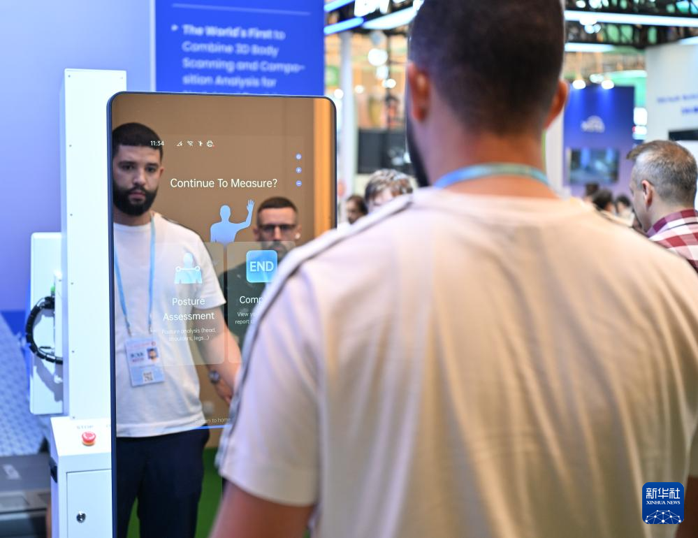 11月3日,客商在广交会展馆体验一款智能身体测量产品。新华社记者 肖恩楠 摄