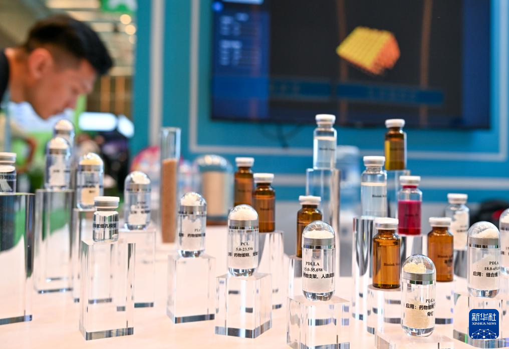 11月3日,观众在广交会展馆捷诺飞生物展台观看生物3D打印的样品。新华社记者 肖恩楠 摄