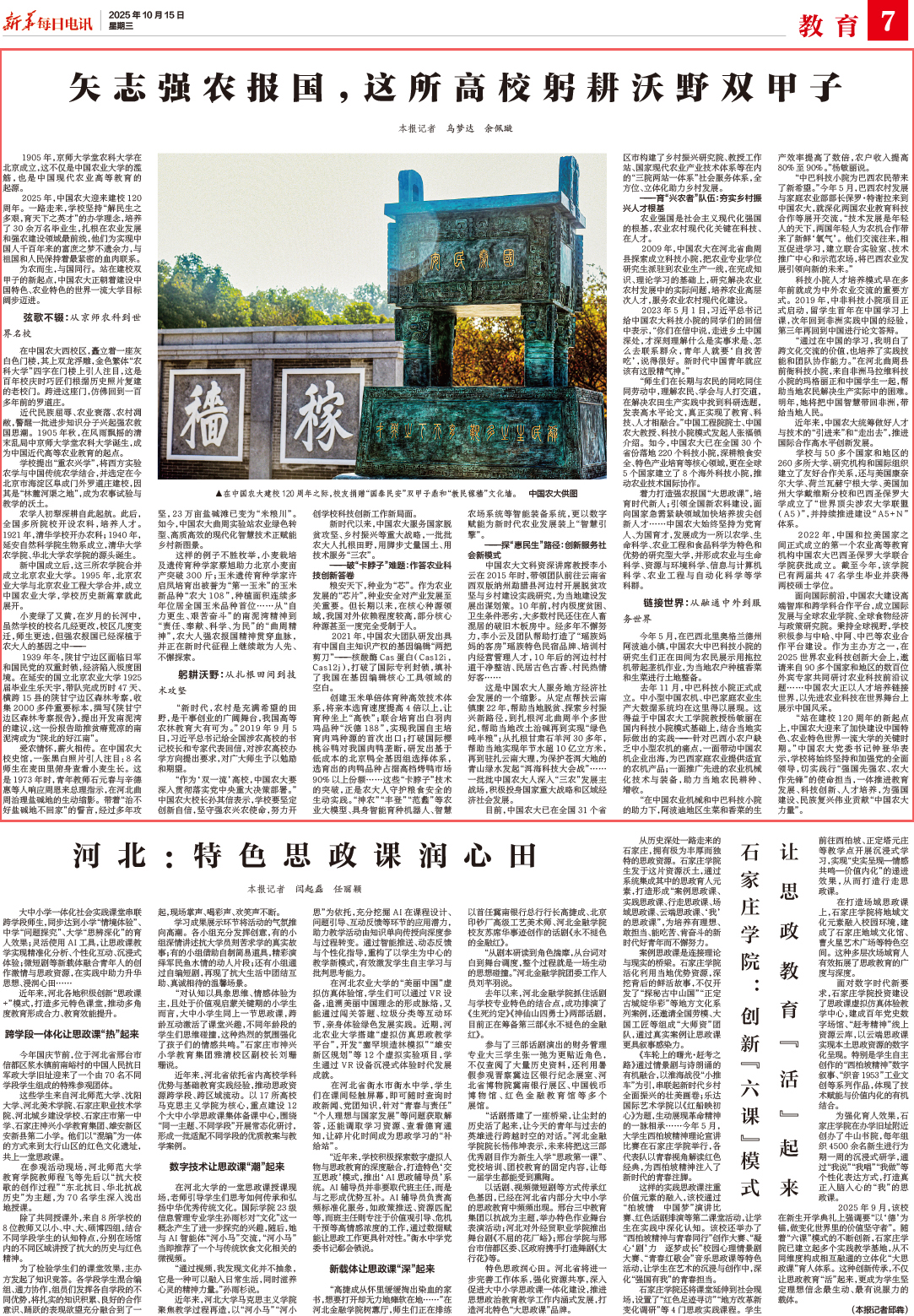 爱农情怀,薪火相传。在中国农大校史馆,一张黑白照片引人注目:8名师生在麦田里俯身查看小麦生长。这是1973年时,青年教师石元春与辛德惠等人响应周恩来总理指示,在河北曲周治理盐碱地的生动缩影。带着“治不好盐碱地不回家”的誓言,经过多年攻坚,23万亩盐碱滩已变为“米粮川”。如今,中国农大曲周实验站农业绿色转型、高质高效的现代化智慧技术正赋能乡村新图景。