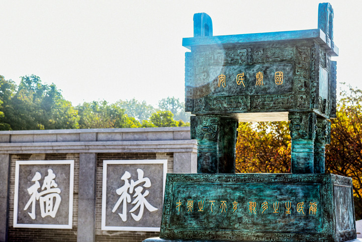 在中国农大建校120周年之际,校友捐赠“国泰民安”双甲子鼎和“教民稼穑”文化墙。(中国农大供图)